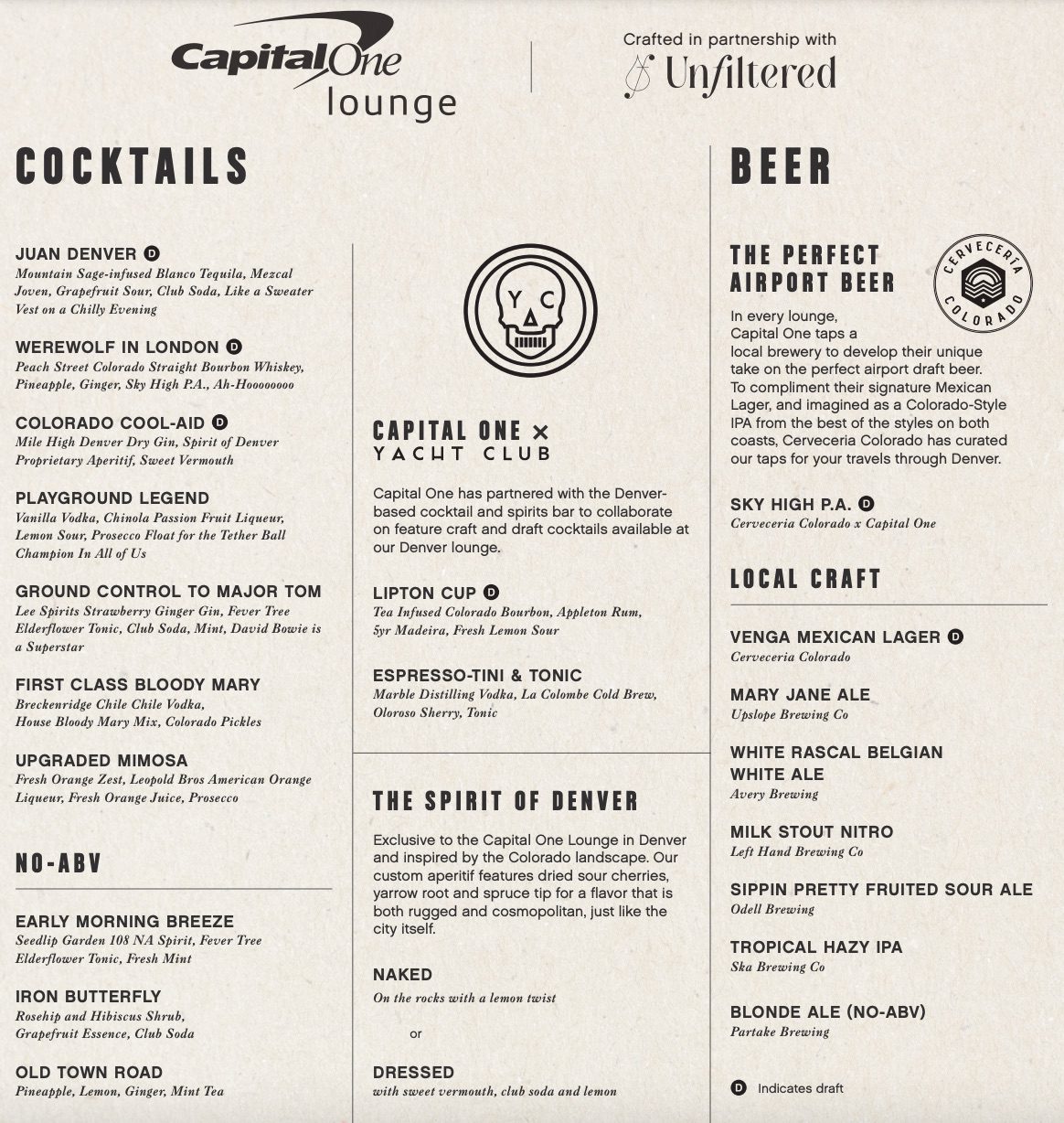 Capital One always partners with a local brewery to brew up a special, lounge-exclusive beer. How could they skip that in Denver, of all places? The result is the “Sky High P.A.” from Cerveceria Colorado, a surprisingly refreshing pale ale. There are plenty of other Colorado craft brews to choose from on the menu, too.