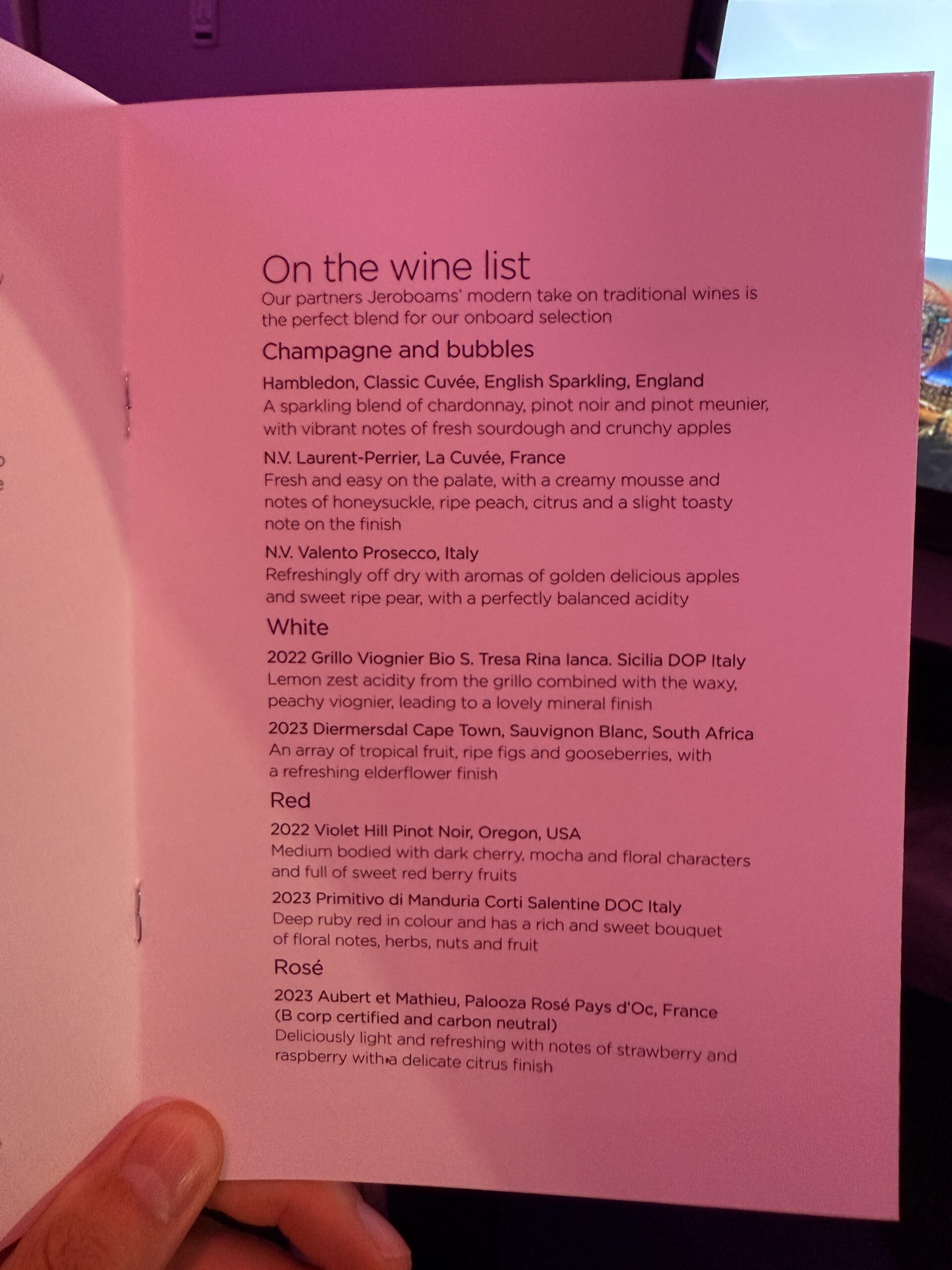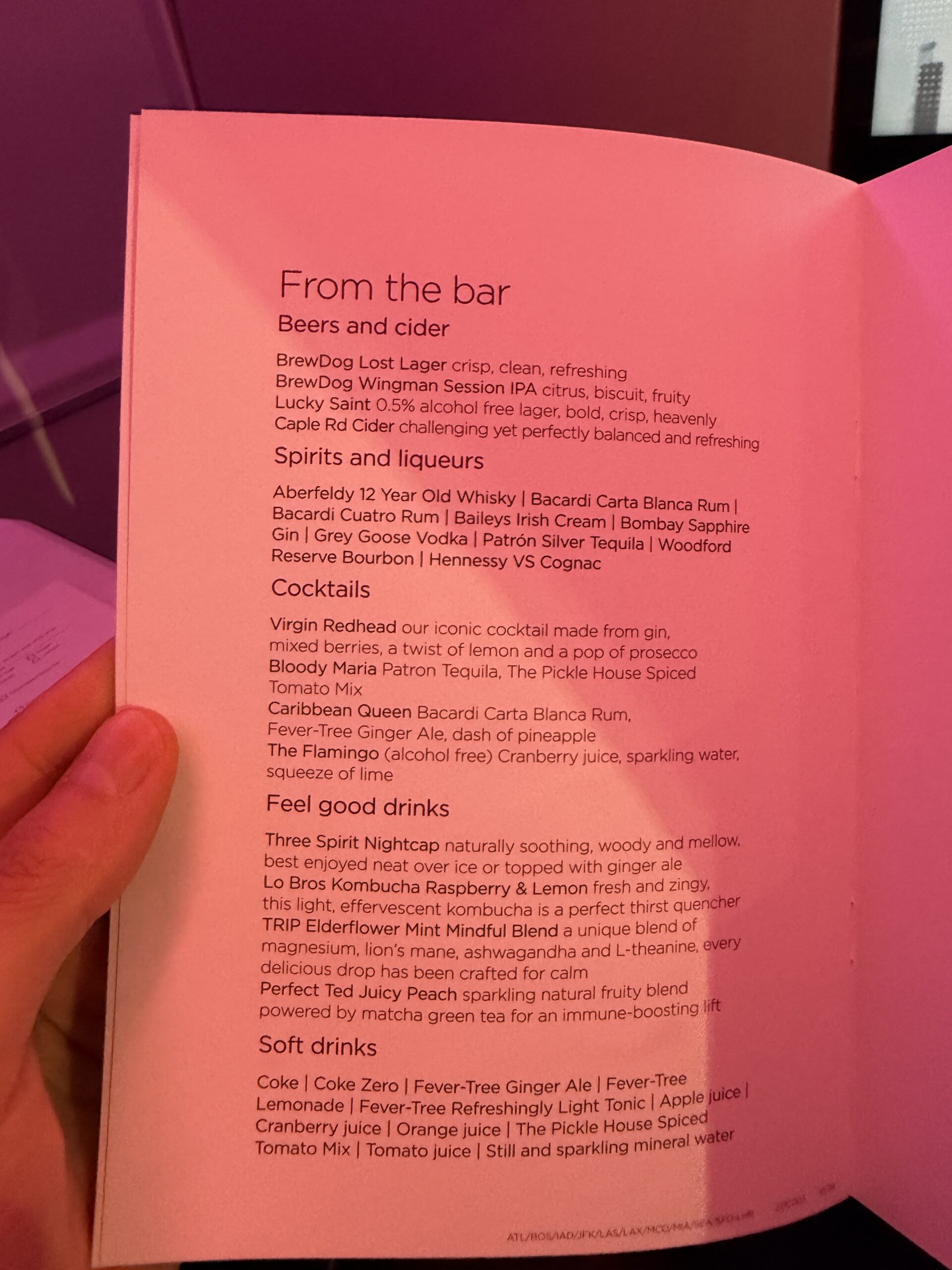 Virgin has a fairly expansive drink selection: three types of sparkling wine (including Laurent-Perrier champagne and a tasty British-made sparkling); a surprising amount of different wines and beers; a few specialty cocktails; and non-alcoholic options like kombucha, soda, and (of course) tea.