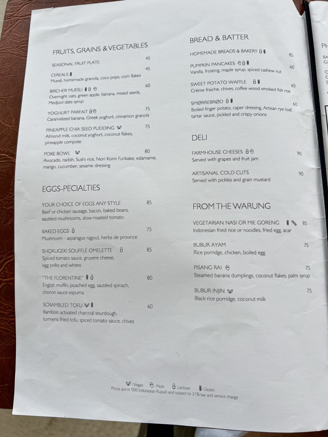 The menu rotates slightly each day. Here's a look at one day's menu – add an “,000” to each price tag for the cost in Indonesian rupiah.
